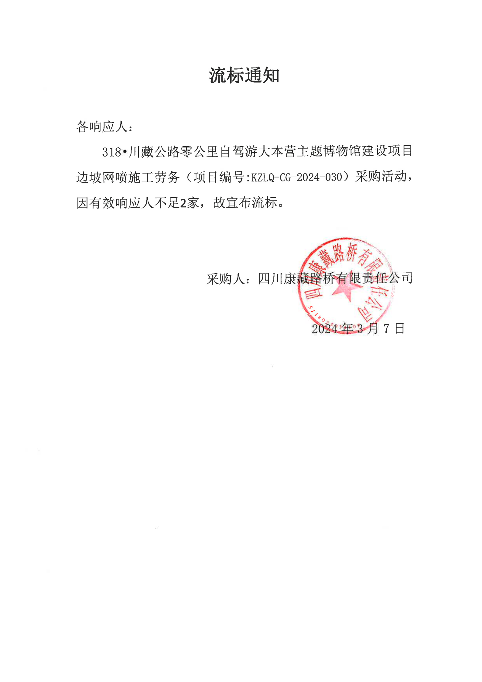 四川康藏路桥有限责任公司318·川藏公路零公里自驾游大本营主题博物馆建设项目边坡网喷施工劳务流标通知