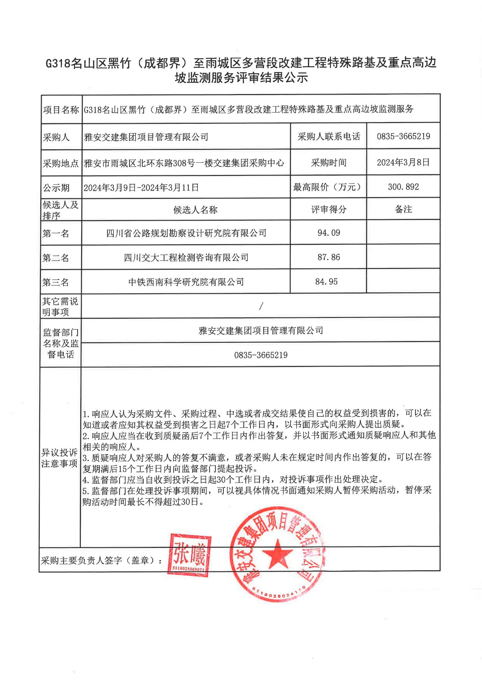 威廉希尔集团项目管理有限公司G318名山区黑竹(成度界)至雨城区多营段改建工程特殊路基及重点高边坡监测服务评审结果公示