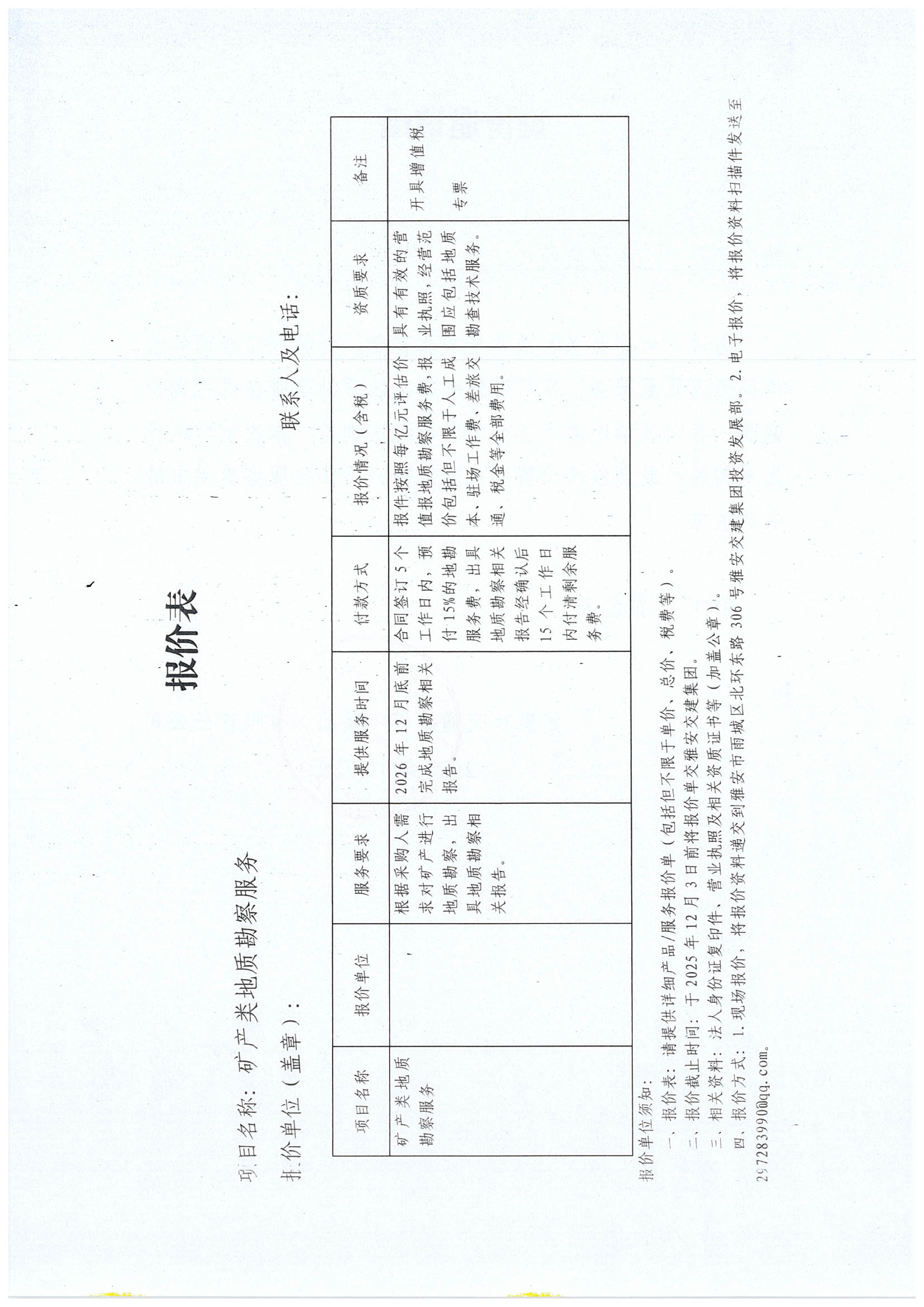 关于雅安市交通建设(集团)有限责任公司矿产类地质勘察服务限价的询价函