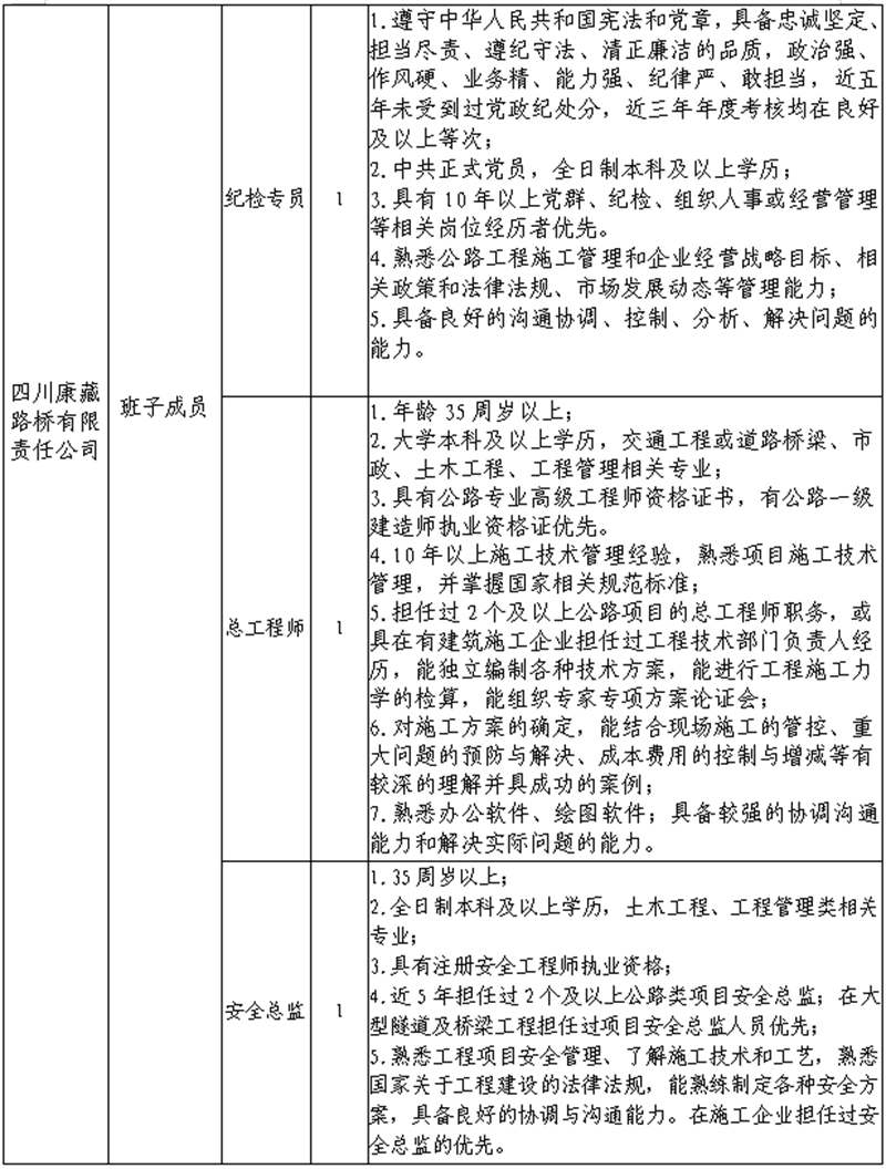根据开展需要,决定面向社会公开招聘雅安市交通建设(集团)有限责任公司(以下简称“威廉希尔集团”)所属子公司班子成员4名,现将有关事项公告如下: