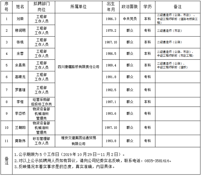 根据集团公司《人才选聘实施办法》,通公告报名、资格审查、综合测试各项招聘程序,对以下拟聘用人员予以公示: