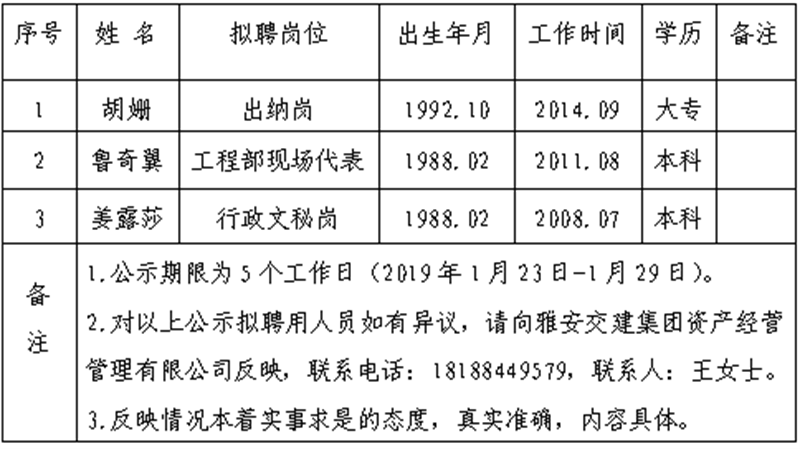 顺利获得公开报名、资格审查、笔试、面试等程序,经威廉希尔集团资产经营管理有限公司研究,对以下3名拟聘用人员予以公示: