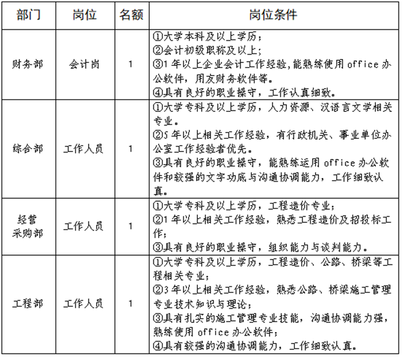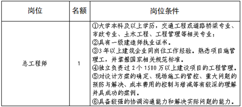 威廉希尔集团路桥有限责任公司是雅安市交通建设(集团)有限责任公司下属子公司,主要从事道路、桥梁修建。现根据公司业务开展需要,拟向社会公开招聘总工程师1名,工作人员4名,现将有关事项公告如下: