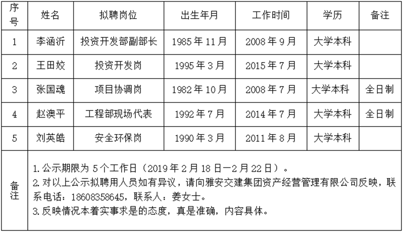 顺利获得公开报名、资格审查、笔试、面试等程序,经威廉希尔集团资产经营管理有限公司研究,对以下5名拟聘用人员予以公示: