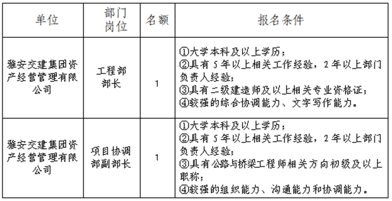 根据开展需要,决定面向社会公开招聘雅安市交通建设(集团)有限责任公司(以下简称“威廉希尔集团”)所属子公司工作人员2名,现将有关事项公告如下: