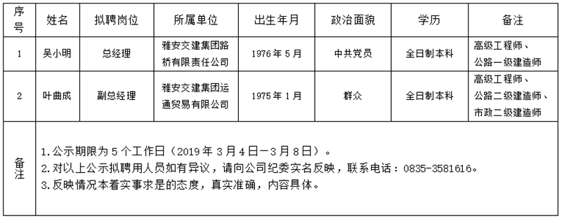 根据集团公司《人才选聘实施办法》,顺利获得资格审查、面试、体检、考察等程序,经集团公司研究,对以下拟聘用人员予以公示: