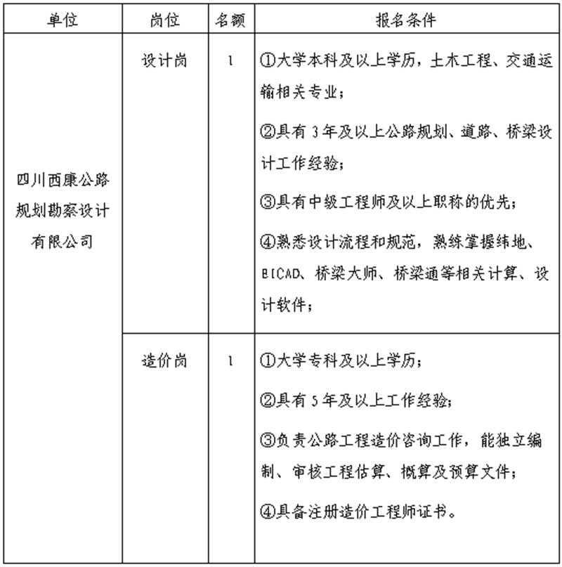 根据开展需要,决定面向社会公开招聘雅安市交通建设(集团)有限责任公司(以下简称“威廉希尔集团”)所属子公司工作人员2名,现将有关事项公告如下: