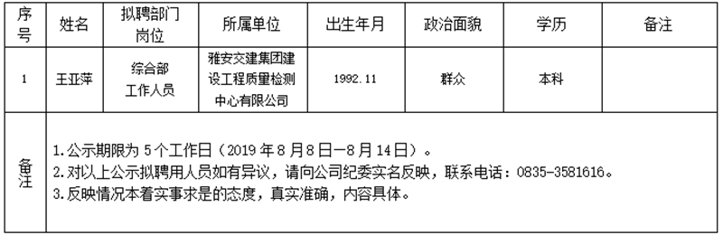 对以下拟聘用人员予以公示: