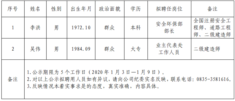 根据集团公司《人才选聘实施办法》,经公开报名、资格审查、笔试、面试等环节,现将以下2名拟聘用人员予以公示: