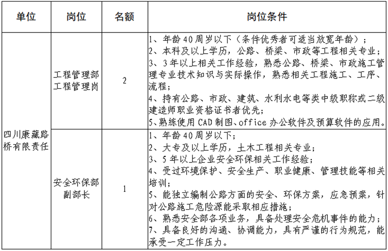 根据开展需要,决定面向社会公开招聘雅安市交通建设(集团)有限责任公司(以下简称“威廉希尔集团”)所属子公司相关人员3名,现将有关事项公告如下: