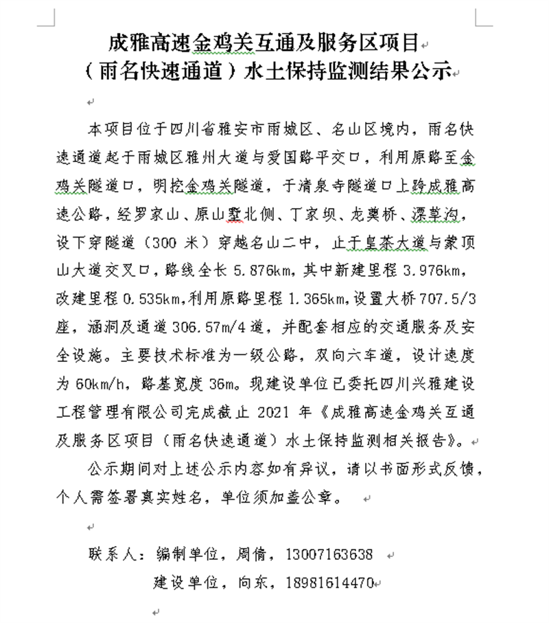 成雅高速金鸡关互通及服务区项目(雨名快速通道)水土保持监测结果公示