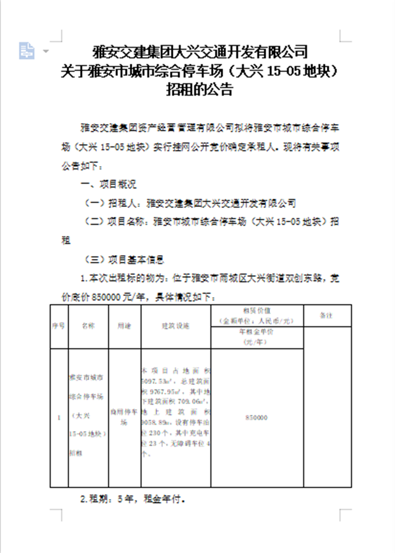 威廉希尔集团大兴交通开发有限公司关于雅安市城市综合停车场(大兴15-05地块)招租的公告