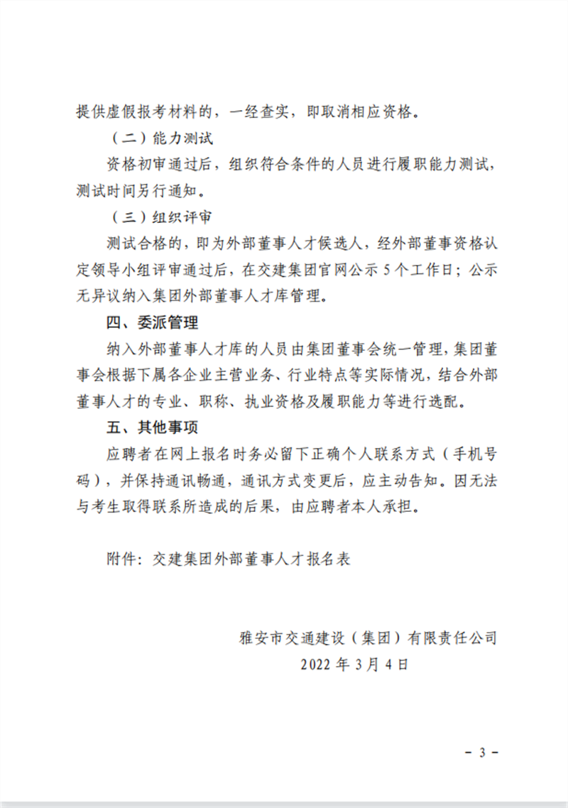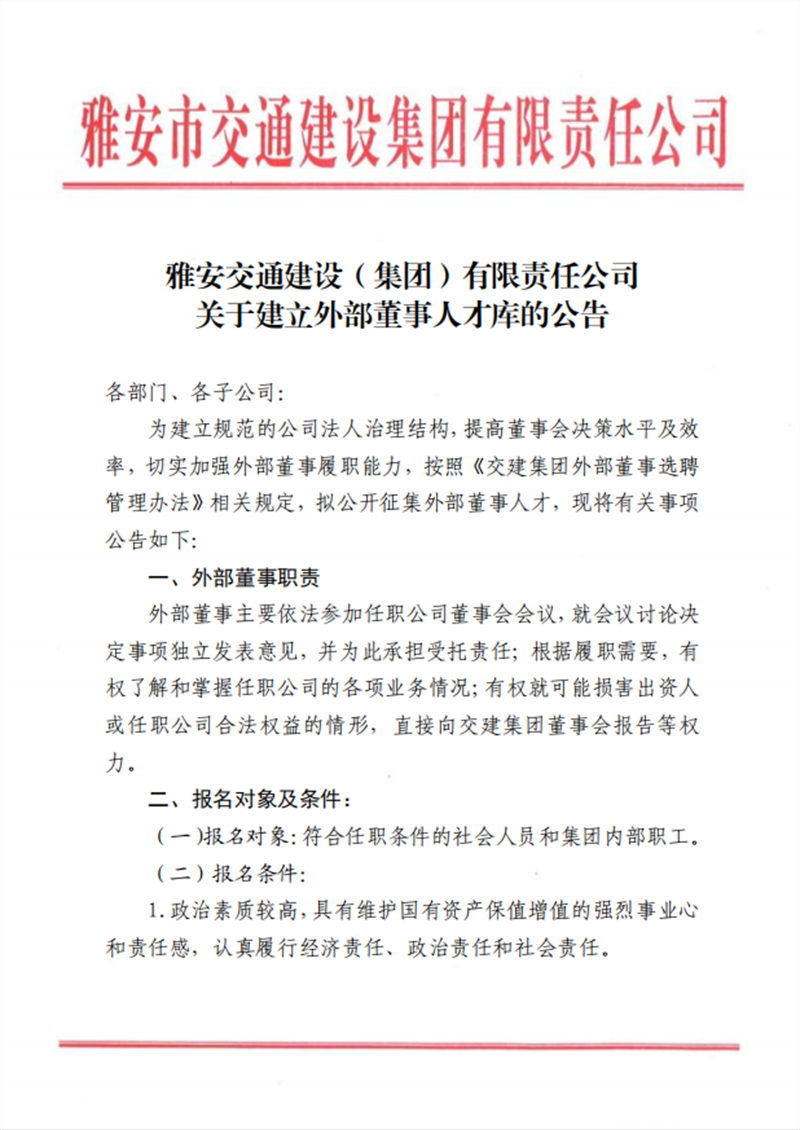 雅安交通建设(集团)有限责任公司 关于建立外部董事人才库的公告