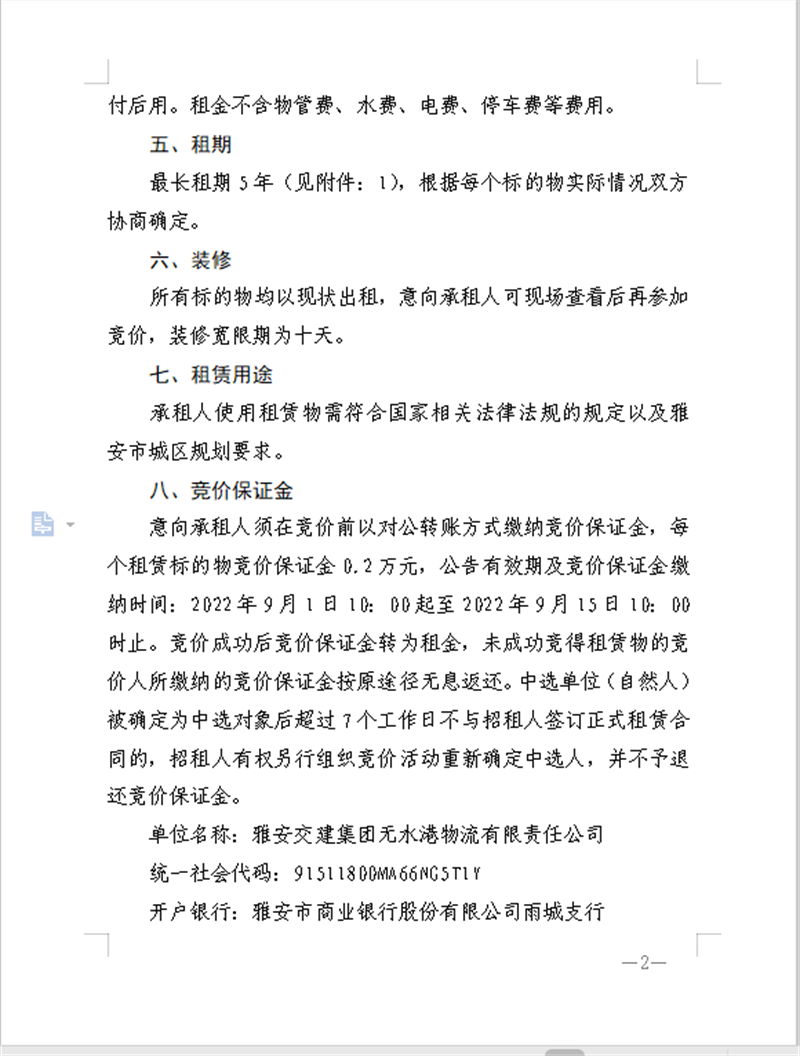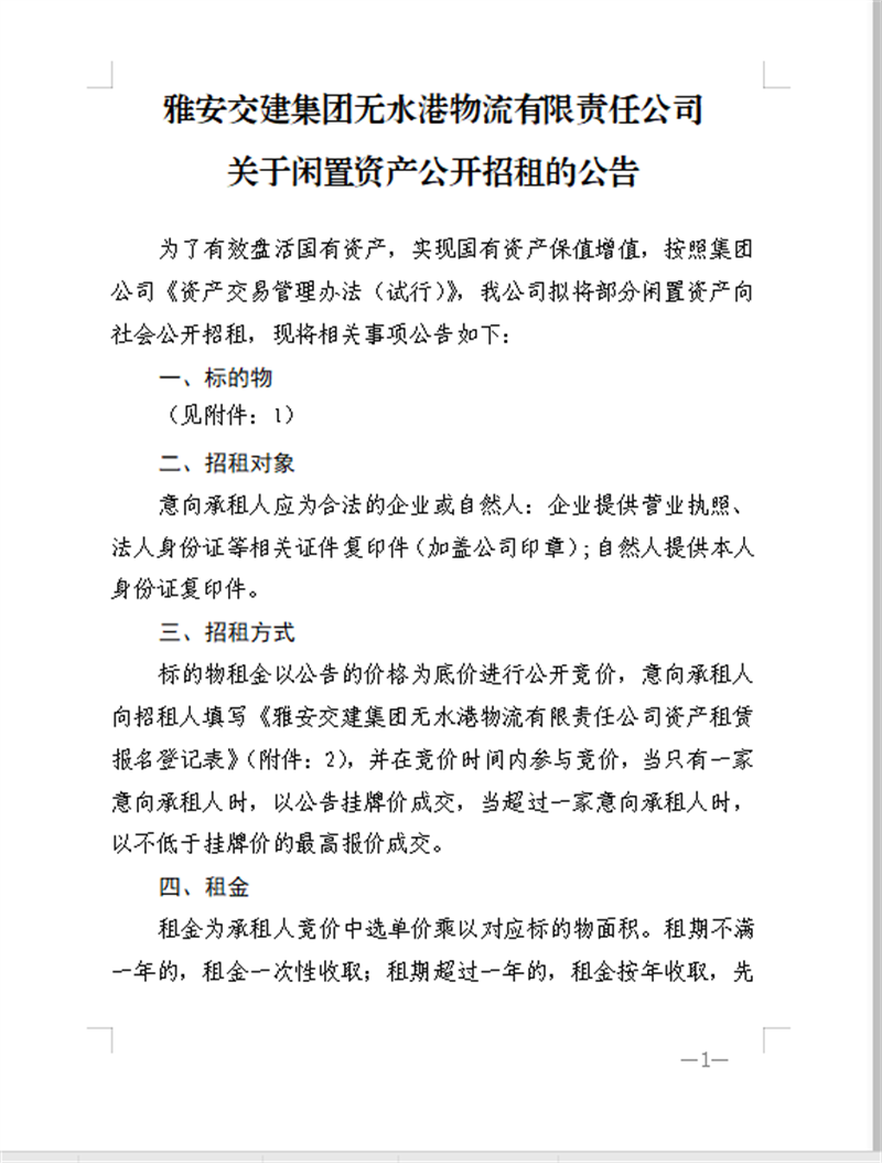 威廉希尔无水港公司关于闲置资产公开招租的公告