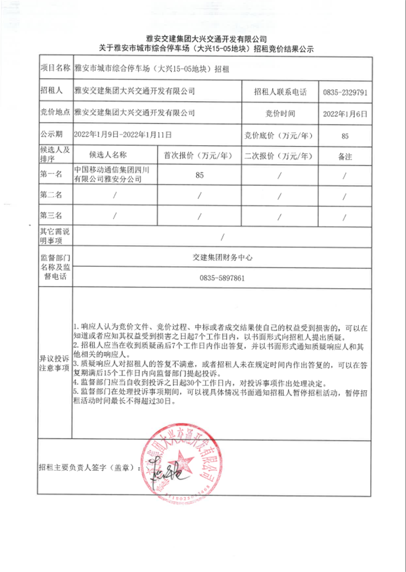 大兴开发公司关于雅安市城市综合停车场(大兴15-05地块)招租竞价结果的公示