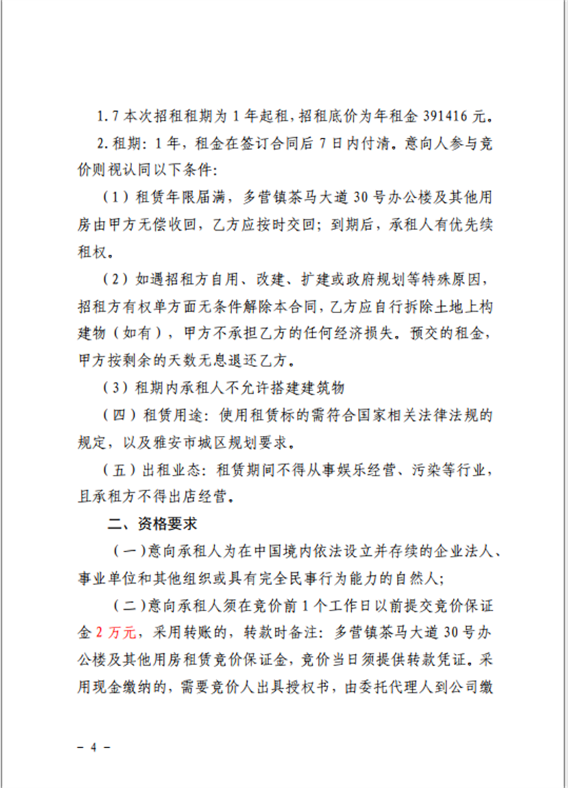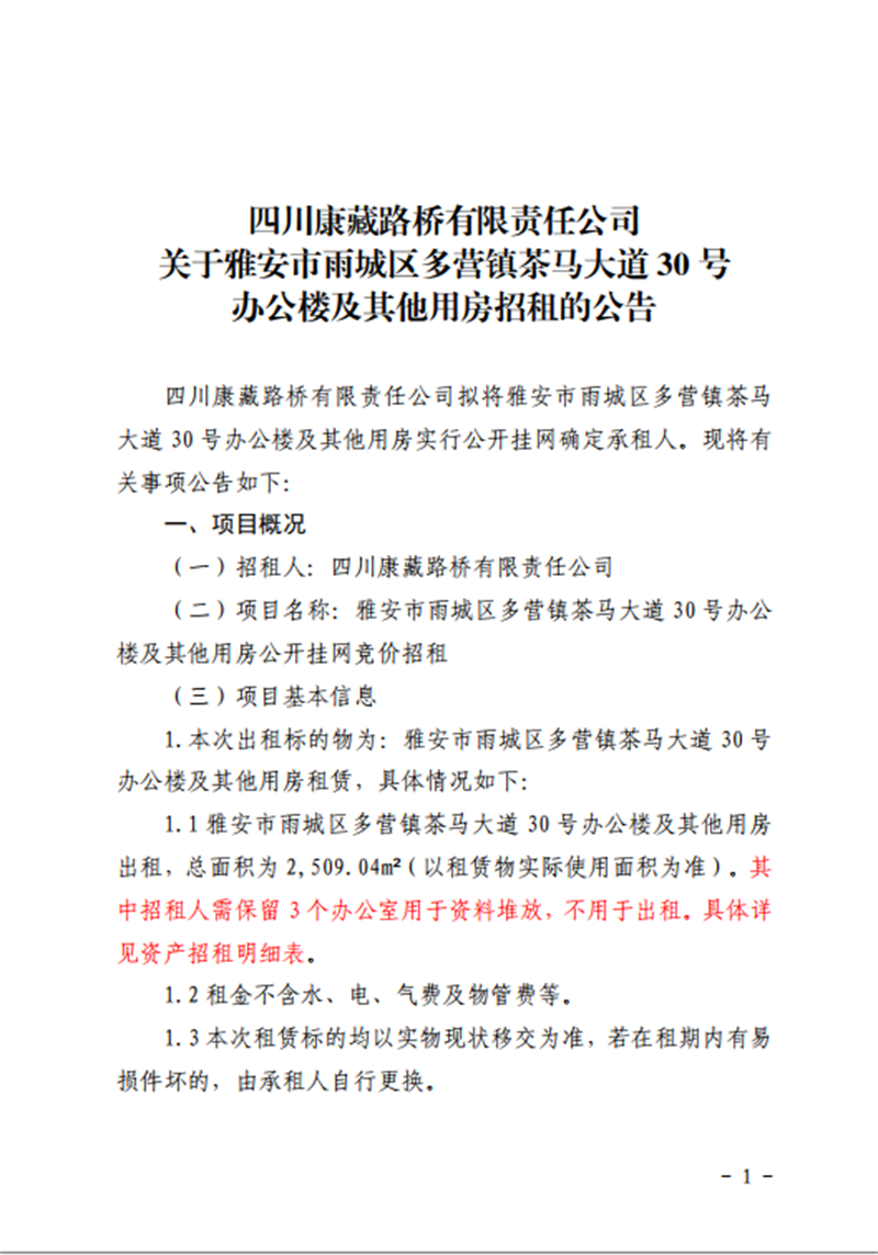 关于雅安市雨城区多营镇茶马大道30号办公楼及其他用房招租的公告