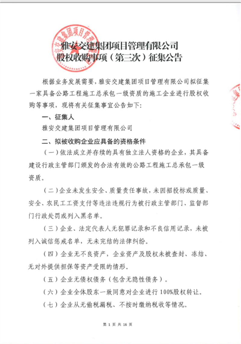 威廉希尔集团项目管理有限公司股权收购事项(第三次)征集公告