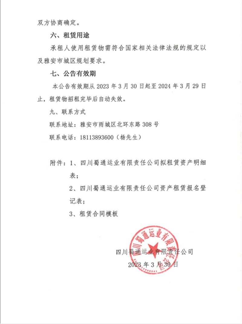 蜀通运业有限责任公司关于闲置资产公开招租的公告