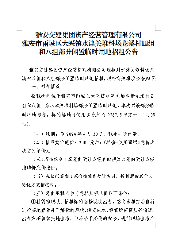 威廉希尔集团资产经营管理有限公司雨城区大兴镇水津关堆料场龙溪村四组和八组部分闲置临时用地招租公告