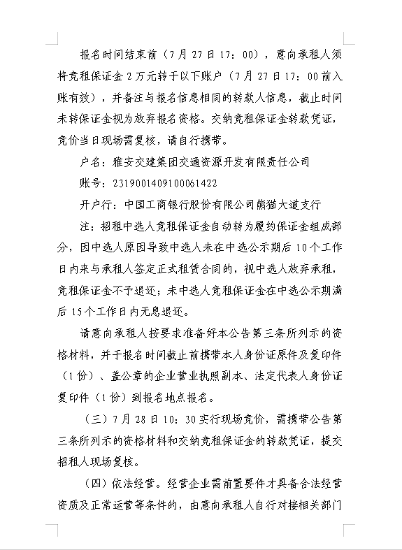 威廉希尔集团交通资源开发有限责任公司雨名快速通道名山服务区场地(游乐类项目)招租公告