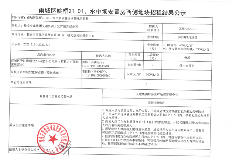 威廉希尔集团交通资源开发有限责任公司关于雅安市雨城区姚桥21-01和水中坝块块招租结果公示