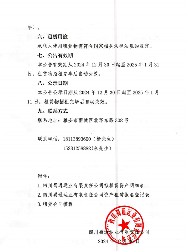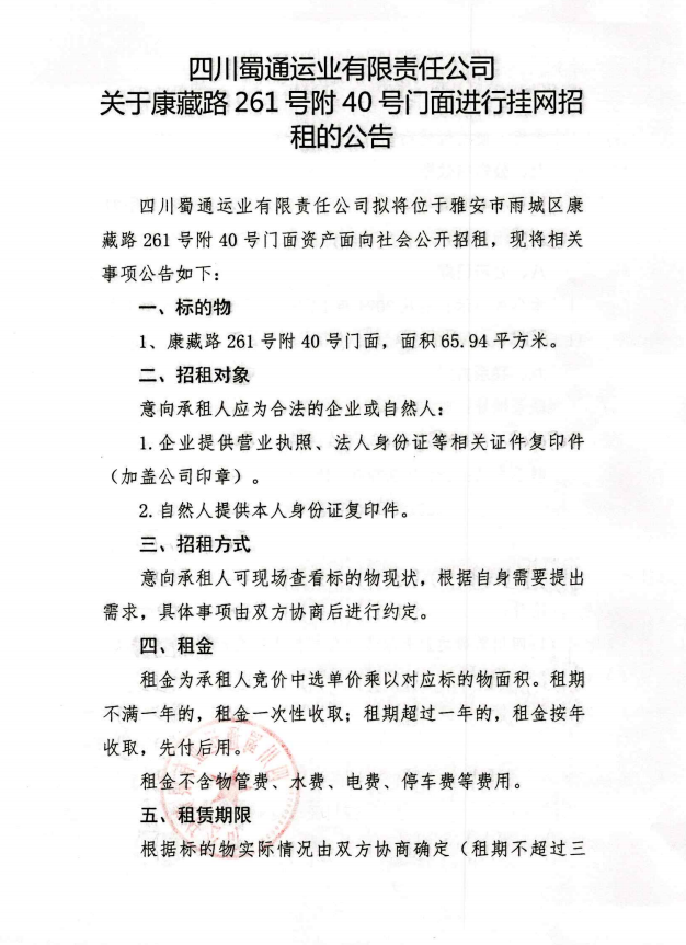 四川蜀通运业有限责任公司 关于康藏路261号附40号门面进行挂网招租的公告