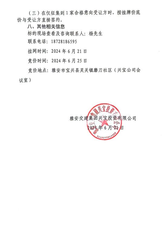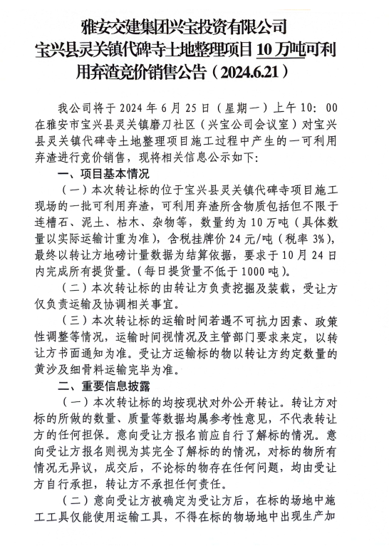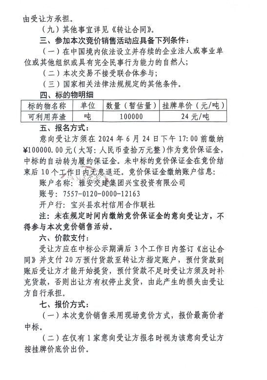 威廉希尔集团兴宝投资有限公司宝兴县灵关镇代碑寺土地整理项目10万吨可利用弃渣竞价销售公告(2024.6.21)