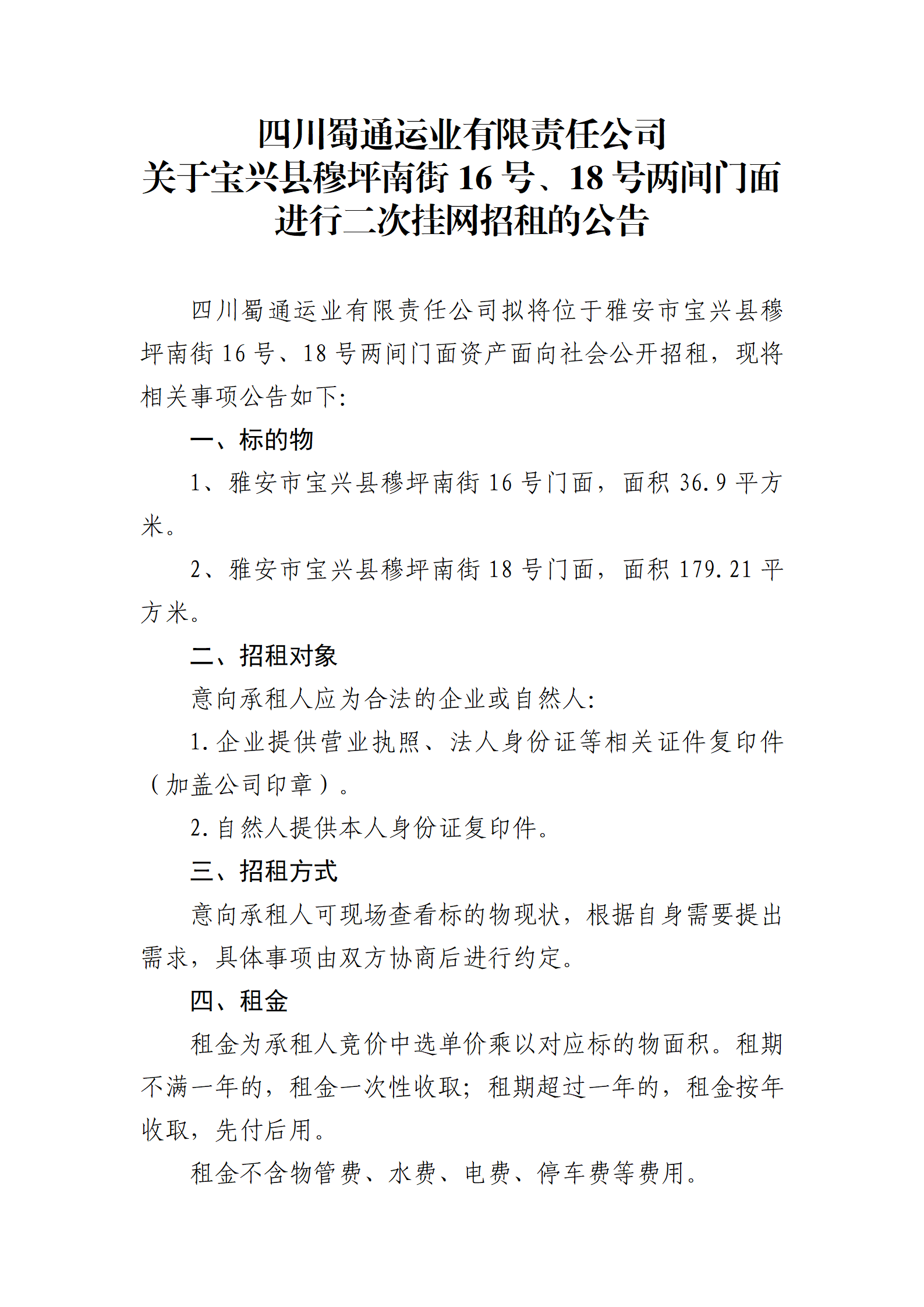 四川蜀通运业有限责任公司 关于宝兴县穆坪南街16号、18号两间门面进行二次挂网招租的公告