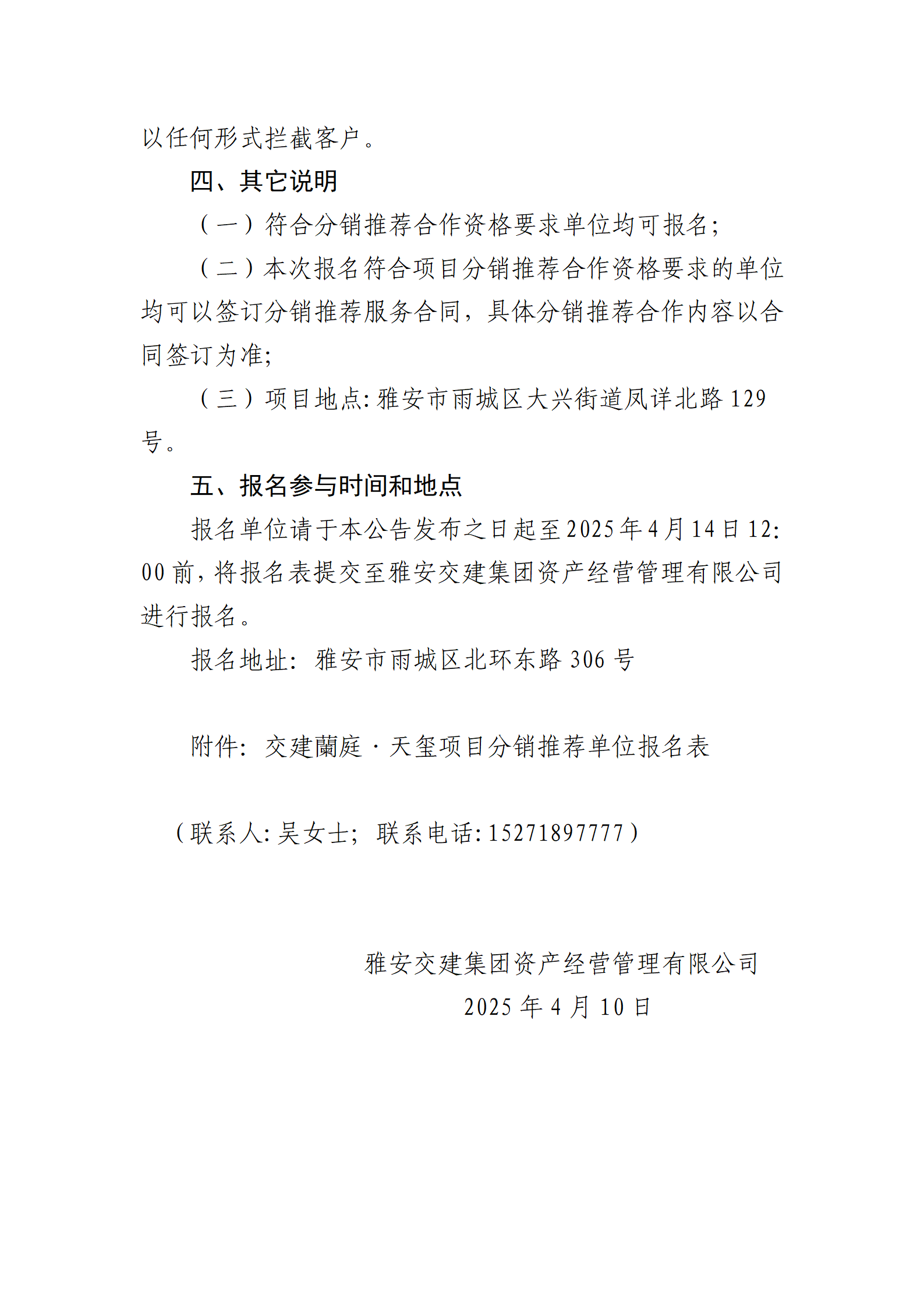 威廉希尔集团资产经营管理有限公司 关于征集蘭庭·天玺项目分销推荐合作单位的公告