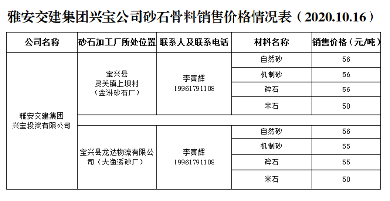 威廉希尔集团兴宝公司砂石骨料销售价格情况表(2020.10.16)