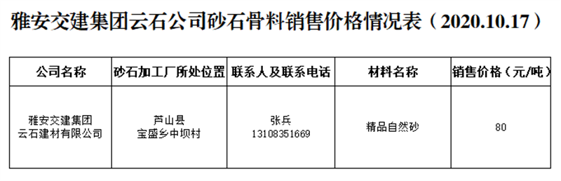 威廉希尔集团云石公司砂石骨料销售价格情况表(2020.10.17)