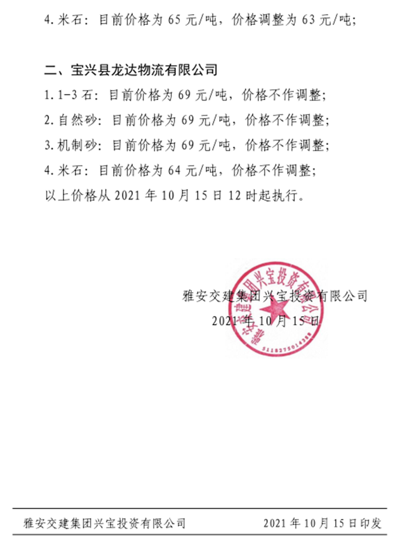 威廉希尔集团兴宝公司关于调整成品料销售价格的通知(2021.10.15)