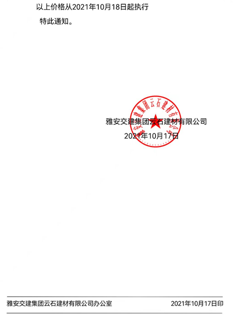 威廉希尔集团云石公司关于调整成品料销售价格的通知(2021.10.17)