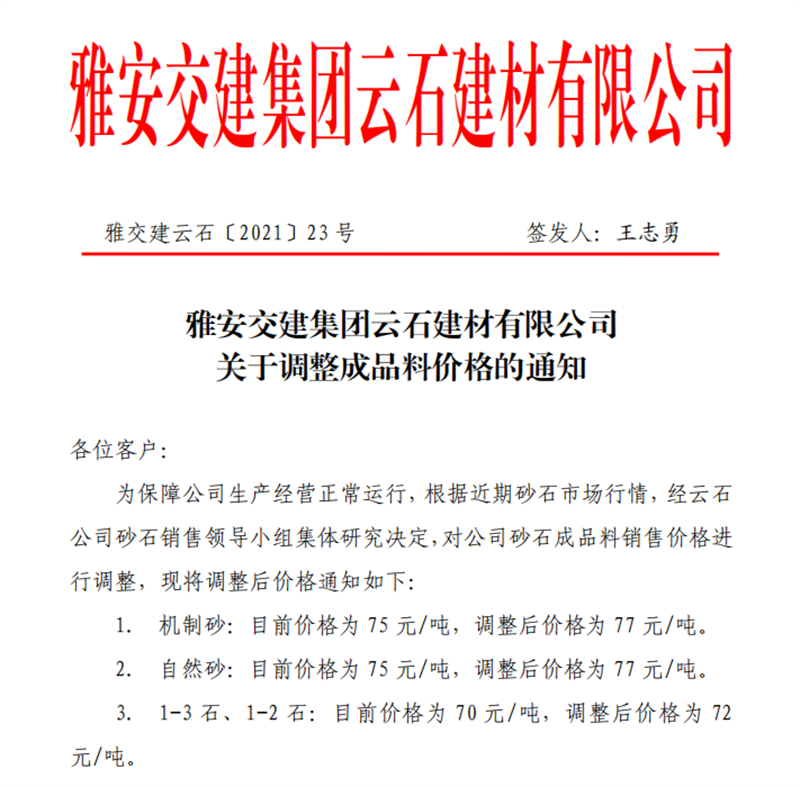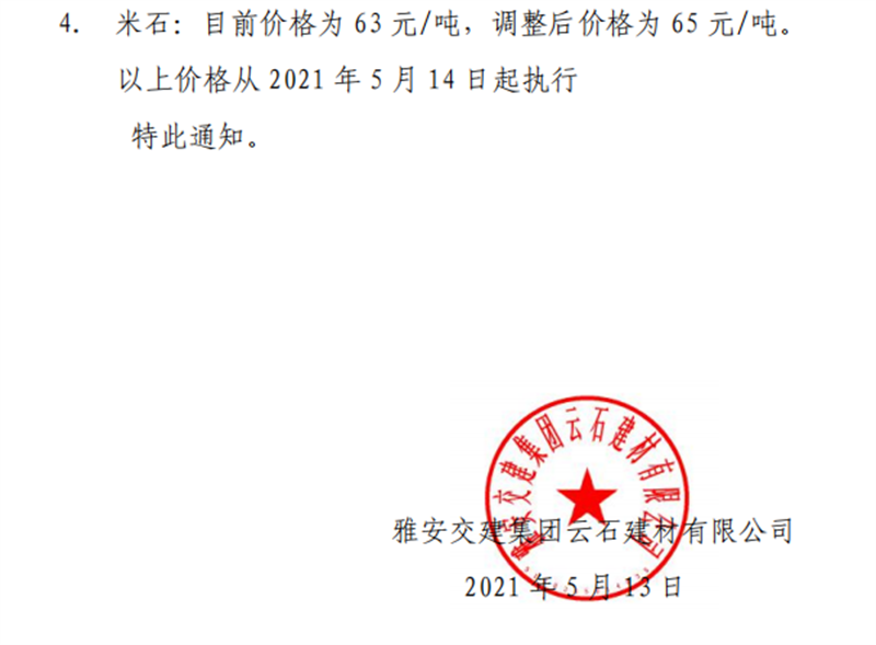 威廉希尔集团云石公司砂石骨料销售价格情况表(2021.5.14)