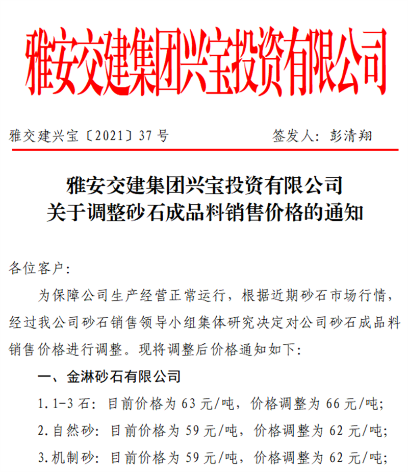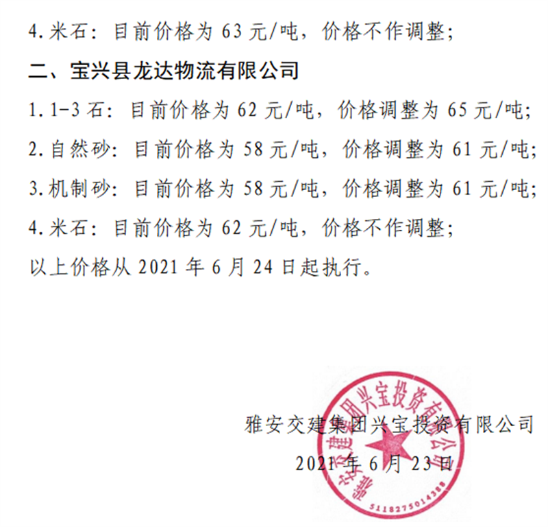威廉希尔集团兴宝公司砂石骨料销售价格情况表(2021.6.23)