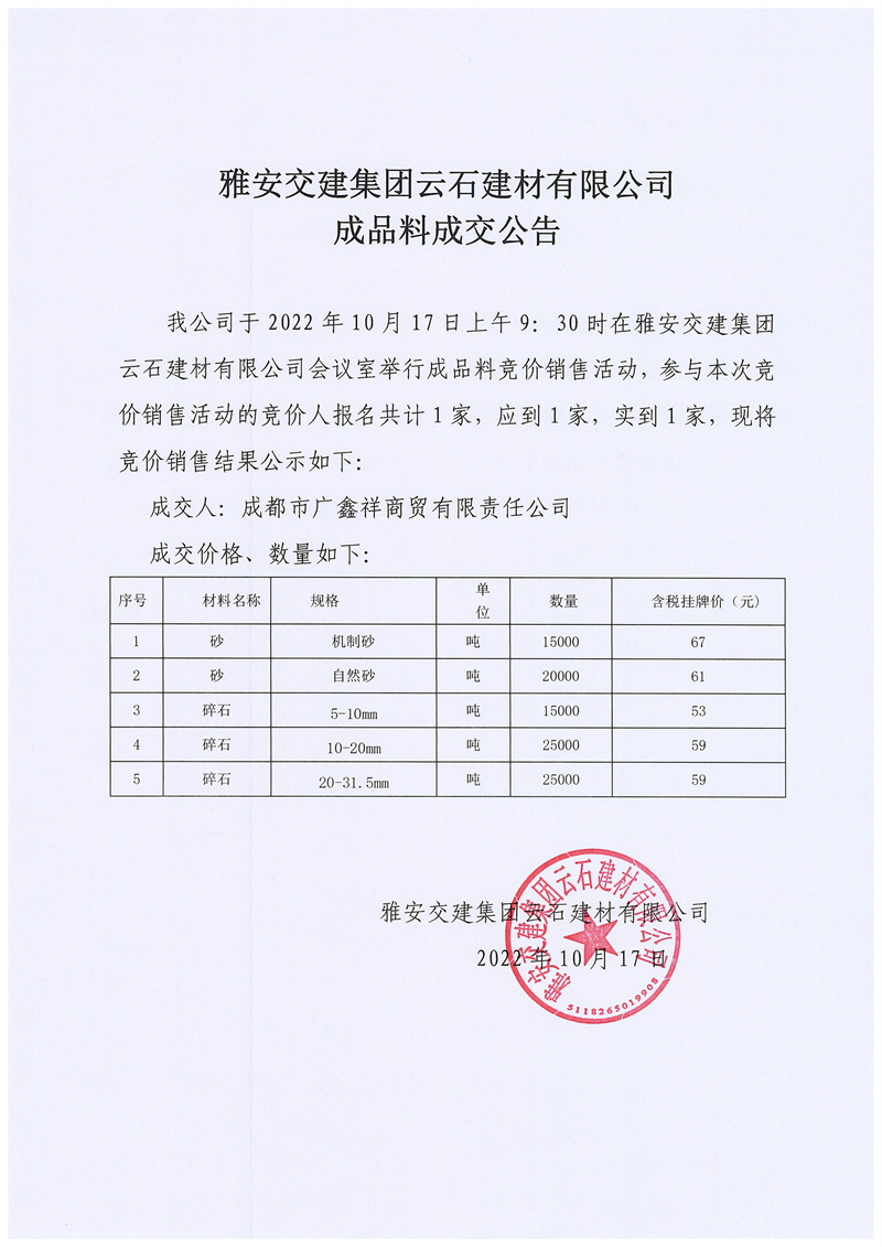 威廉希尔集团云石建材有限公司成品料成交公告10.17