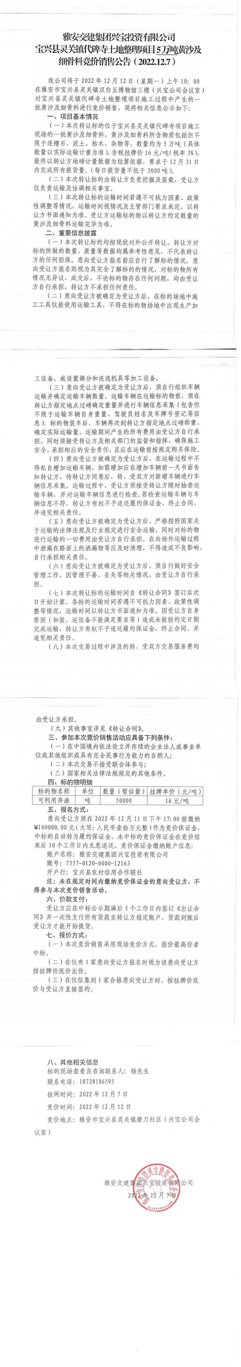威廉希尔集团兴宝投资有限公司宝兴县灵关镇代碑寺土地整理项目5万吨黄沙及细骨料竞价销售成交公告(2022-12-12)