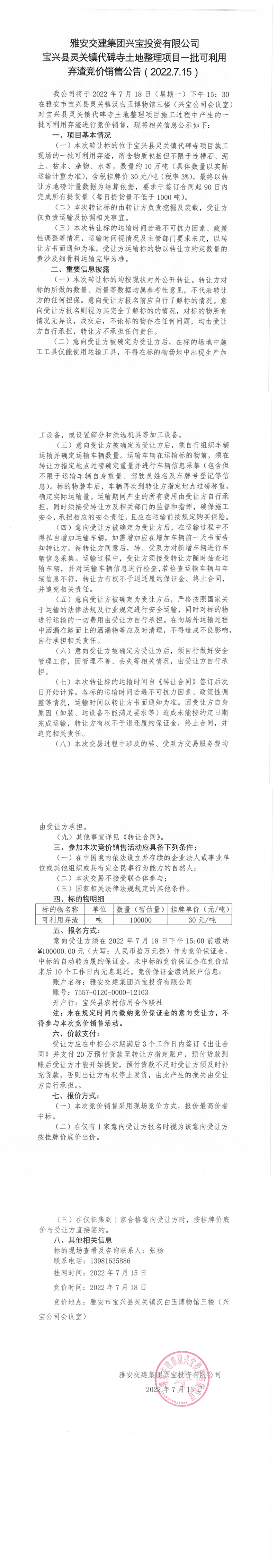 宝兴县灵关镇代碑寺土地整理项目一批可利用弃渣竞价销售公告7.15(10万吨)