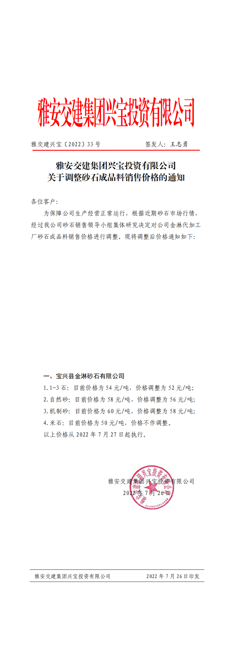 雅交建兴宝〔2022〕33号 关于调整砂石成品料销售价格的通知--7.27