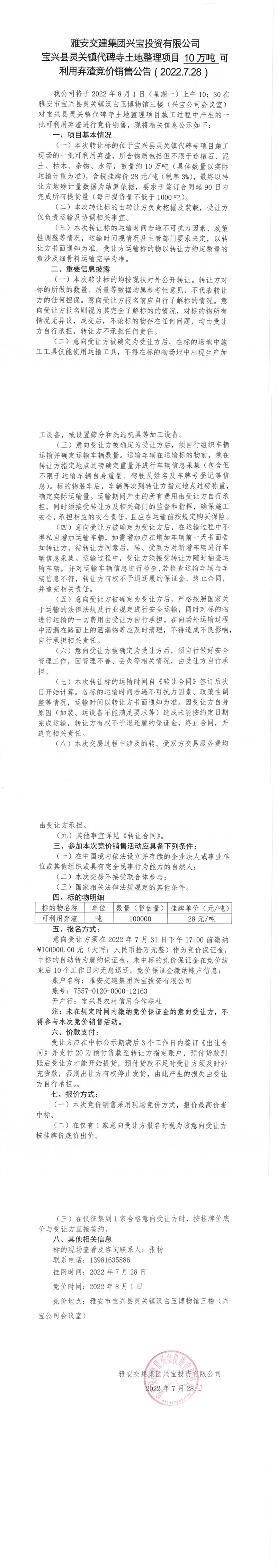 威廉希尔集团兴宝投资有限公司灵关镇代碑寺土地整理项目10万吨可利用弃渣竞价销售公告(2022.7.28)