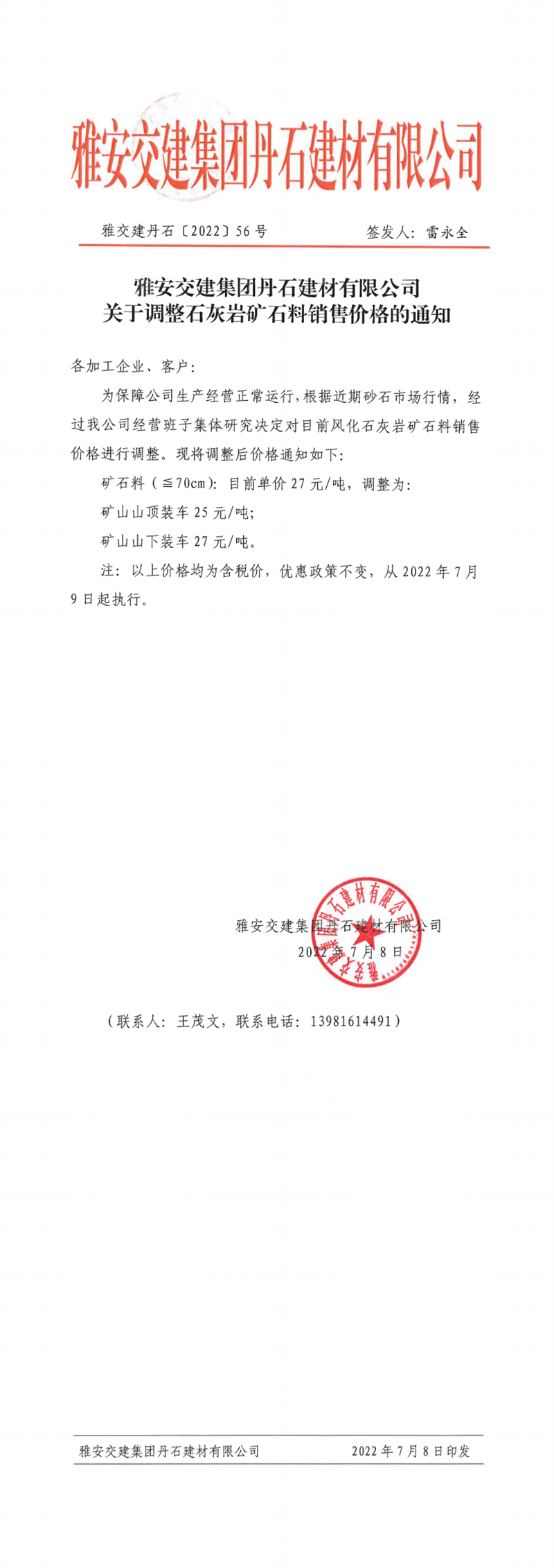 雅交建丹石关于调整石灰岩矿石料销售价格的通知(2022-7-8)
