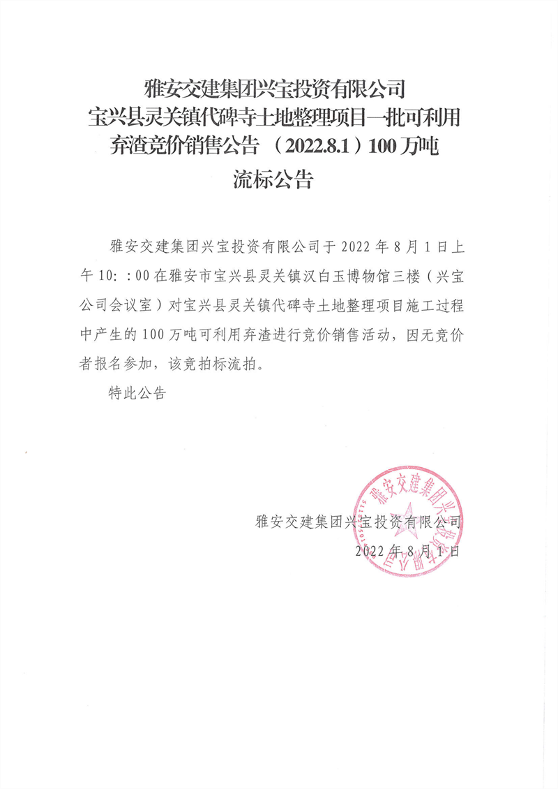 威廉希尔集团兴宝投资有限公司灵关镇代碑寺土地整理项目100万吨可利用弃渣竞价销售流标公告(2022.8.1)