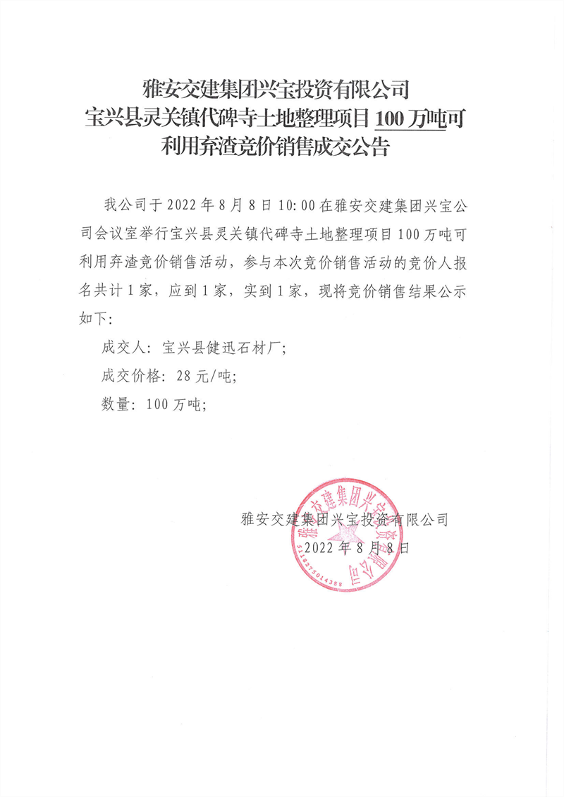 代碑寺土地整理项目100万吨可利用弃渣竞价销售成交公告