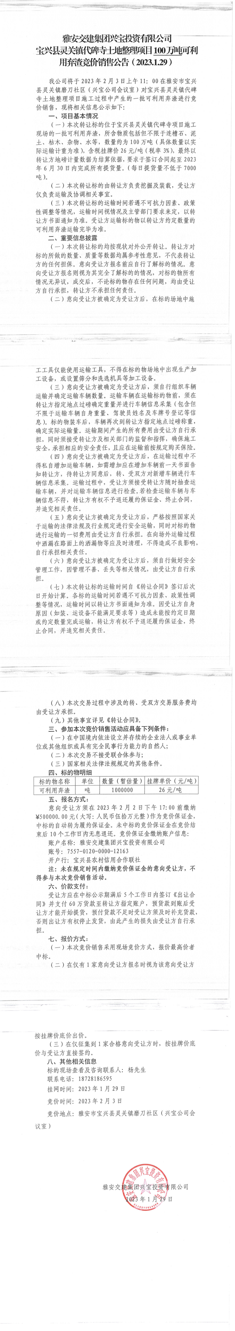 威廉希尔集团兴宝投资有限公司灵关镇代碑寺土地整理项目100万吨可利用弃渣竞价销售公告(2023.1.29)