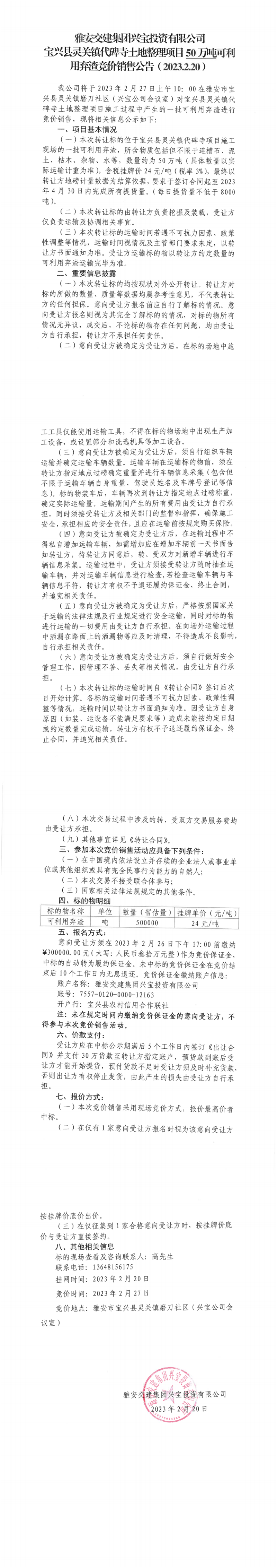 威廉希尔集团兴宝投资有限公司灵关镇代碑寺土地整理项目50万吨可利用弃渣竞价销售公告(2023.2.20)、