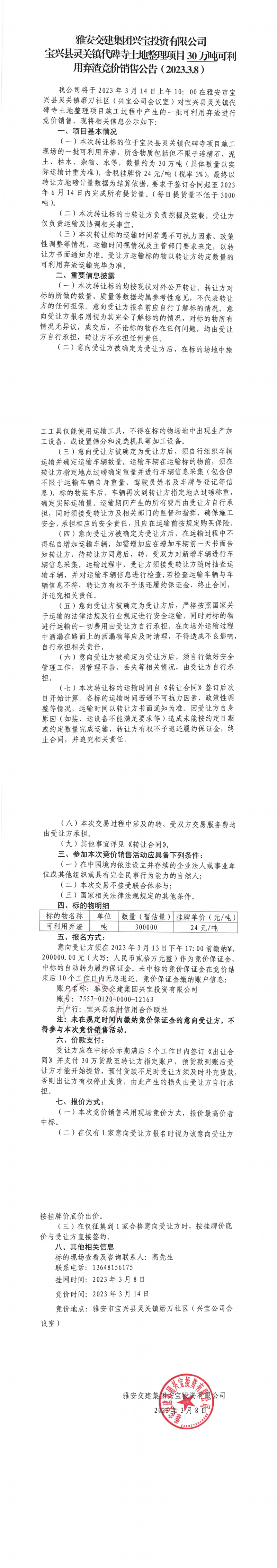 威廉希尔集团兴宝投资有限公司灵关镇代碑寺土地整理项目30万吨可利用弃渣竞价销售公告(2023.3.8)