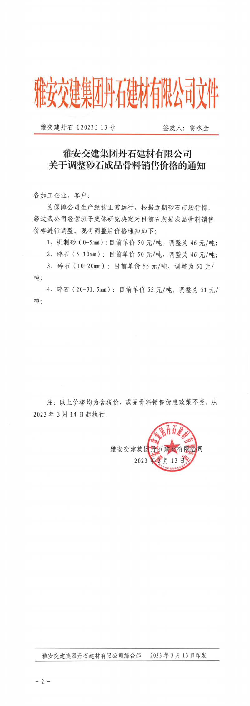 威廉希尔集团兴宝投资有限公司关于调整成品料价格的通知(2023.03.13)