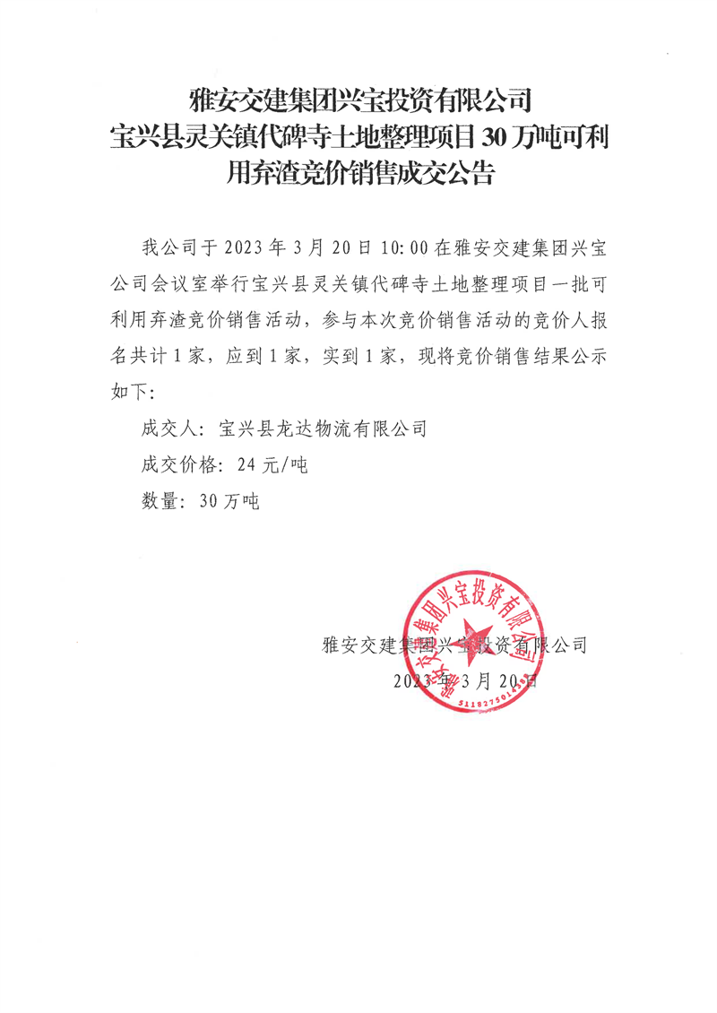 威廉希尔集团兴宝投资有限公司灵关镇代碑寺土地整理项目30万吨可利用弃渣竞价销售成交公告(2023.3.20)