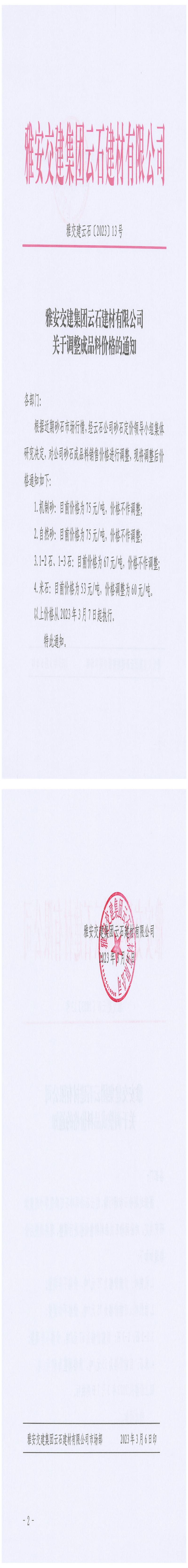 威廉希尔集团云石建材有限公司关于调整成品料价格的通知-2023-03-06